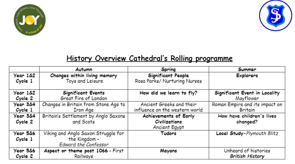 History is taught in half termly units, alternating with geography. Our History Curriculum is designed to start with the world closest to our youngest children, and gradually expand to include the breadth of the National Curriculum requirements. Skills and knowledge are planned to progress and build and pupils are encouraged to reflect, remember and make links as they learn. Through following the history of Britain and its invaders and settlers; we consider the importance of ancient civilisations and empires and how they may have influenced us; we think about changes in living memory and beyond living memory. A whole school timeline which builds with the children’s learning journey, enables them to see each topic within its context and gradually become familiar with dates and chronology; taking into account significant events, eras and people. Teaching uses the Recap & Recall format of questions at the start of each lesson, covering questions based on chronological understanding, key vocabulary and learning from a previous unit. Planning and questions use explicit links to the school curriculum, helping the children to make links and build on their learning skills from other subjects such as English and Geography. Furthermore, we teach discrete tier two and three vocabulary is taught in each topic area to support knowledge acquisition and enhance the children’s vocabulary. The curriculum teaching specific historical skills such as asking appropriate questions, interrogating sources and making judgments are regularly modelled, practised and refined. Hook Days for History and Geography enable children to recall and remember their recent studies, make links to previous learning and spend a day immersed in this area of the curriculum twice a year. Where possible children learn through fieldwork trips and outside learning support our teaching. The school's Gospel values are embedded in each topic and children are regularly encouraged to discuss their learning in the light of these.